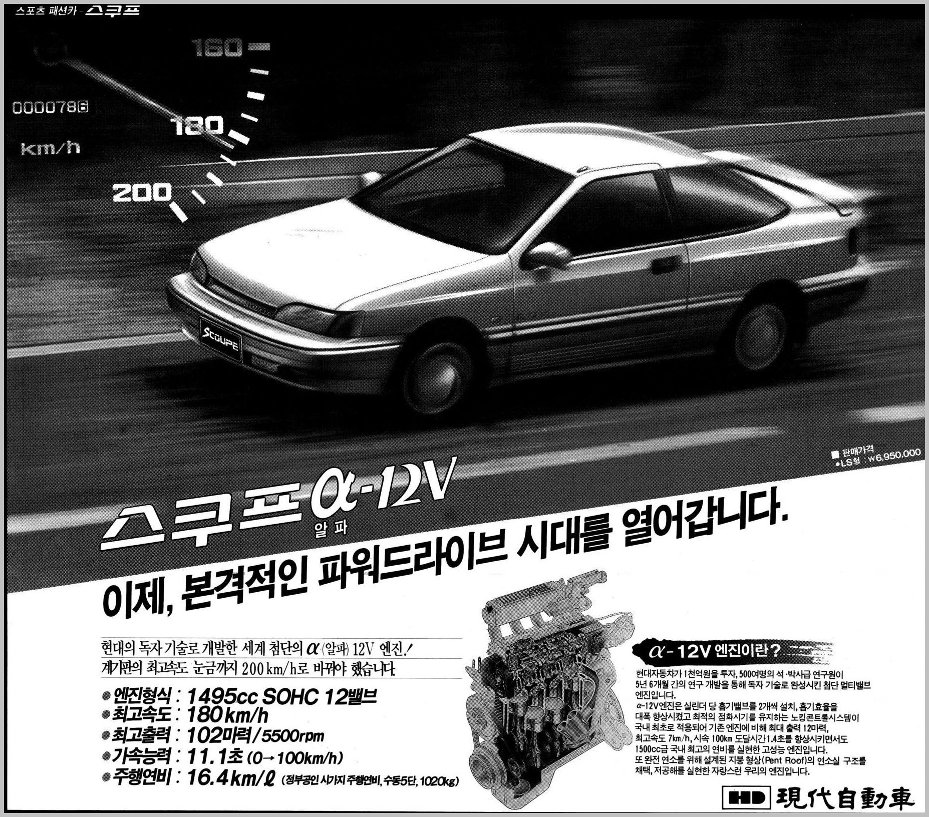 1991년 5월 스쿠프 알파-12V 출시 현대자동차가 1천억원을 투자, 500여명의 석 박사급 연구원이 5년 6개월 간의 연구 개발을 통해 독자 기술로 완성시킨 첨단 멀티밸브 엔진입니다. 알파-12V 엔진은 실린더 당 흡기밸브를 2개씩 설치, 흡기효율을 대폭 향상시켰고 최적의 점화시기를 유지하는 노킹콘트롤시스템이 국내 최초로 적용되어 기존 엔진에 비해 최대 출력 12마력, 트 최고속도 7km/h, 시속 100km 도달시간 1.4초를 향상시키면서도 1500cc급 국내 최고의 연비를 실현한 고성능 엔진입니다.