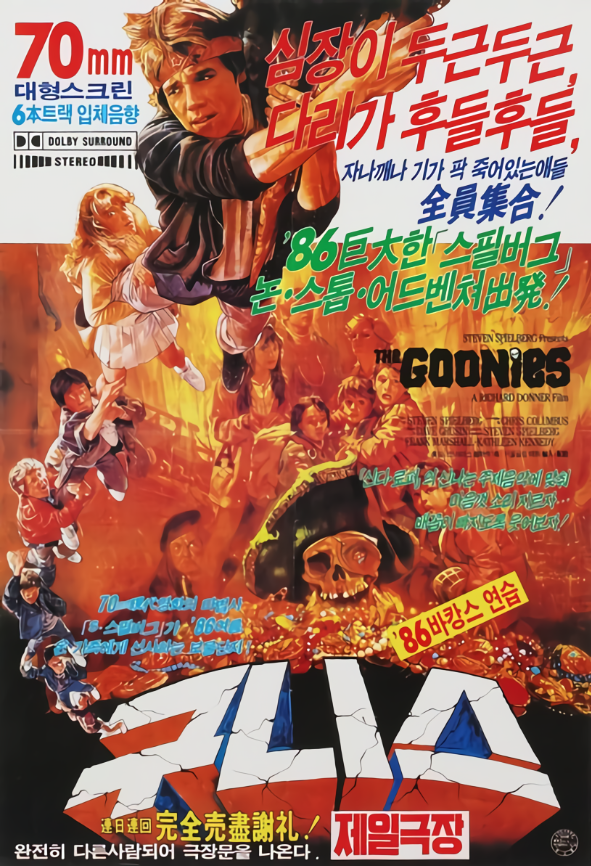 <이티,1982>의 스티븐 스필버그가 아이디어를, <나홀로 집에, 1990>의 크리스 콜럼버스가 각본을, <슈퍼맨, 1978>의 리처드 도너가 연출을 밭은 1980년대를 대표하는 가족영화의 고전이다. 80년대를 주름잡았던 세명의 흥행사가 한데 모였다는 것도 이례적인 일이지만 이들 모두가 가족 엔터테인먼트의 내로라하는 대가들이 됐다는 것도 놀랄 만한 사실이다. <이티, 1982><레이더스,1981><백 투 더 퓨쳐, 1985> 등 80년대 가족 관객을 대상으로 한 오락영화들이 최전성기를 구가하던 시절에 등장한 <구니스>는 80년대 유년기를 보낸 40대 이상 세대에는 잊을 수 없는 기억이다. 이젠 추억으로나 곱씹을 과거의 유물이 됐지만 미지의 세계를 향한 소년, 소녀들의 보편적 갈말을 형상화한 손에 땀을 쥐게 하는 모험담은 여전히 퇴색되지 않은 즐거움을 준다.